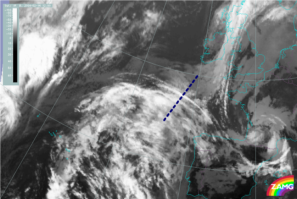 16 February 2004/12.00 UTC - Meteosat IR image; position of vertical cross section indicated from SW to NE