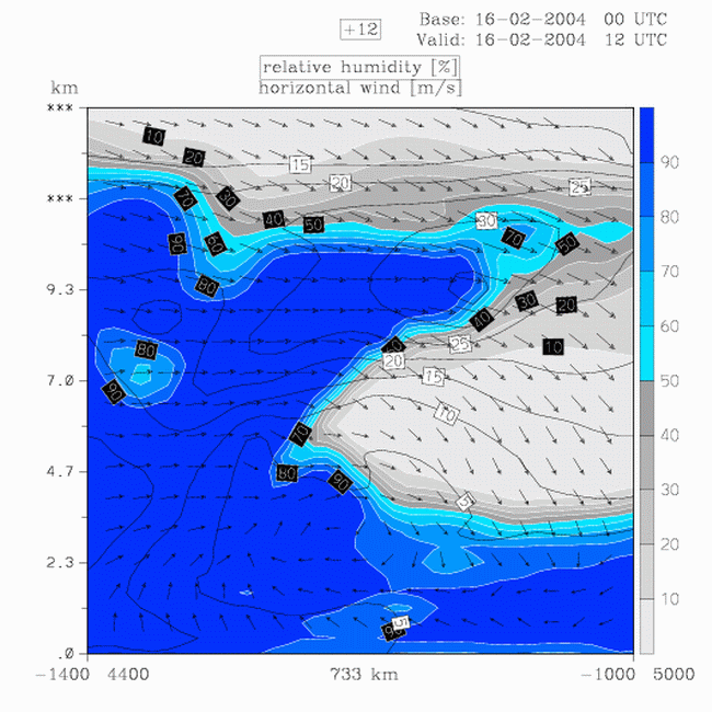 16 February 2004/12.00 UTC - ALADIN Vertical cross section; black: isotachs, blue: relative humidity, wind arrows superimposed