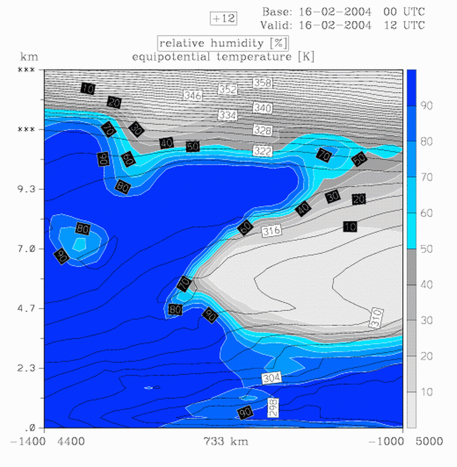 16 February 2004/12.00 UTC - ALADIN Vertical cross section; black: isentropes (ThetaE), blue: relative humidity