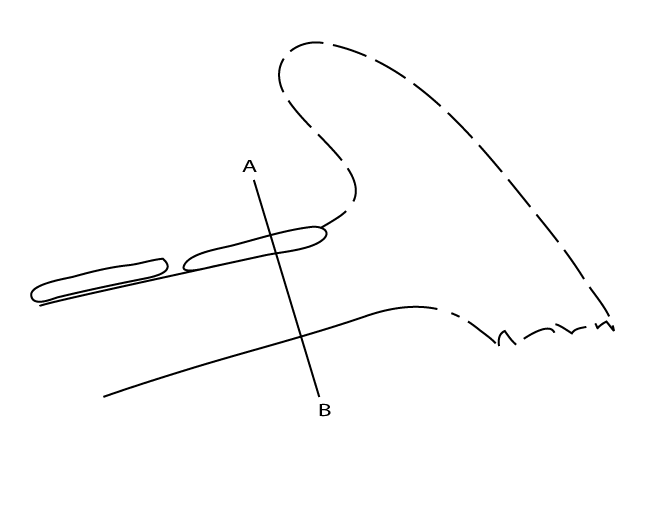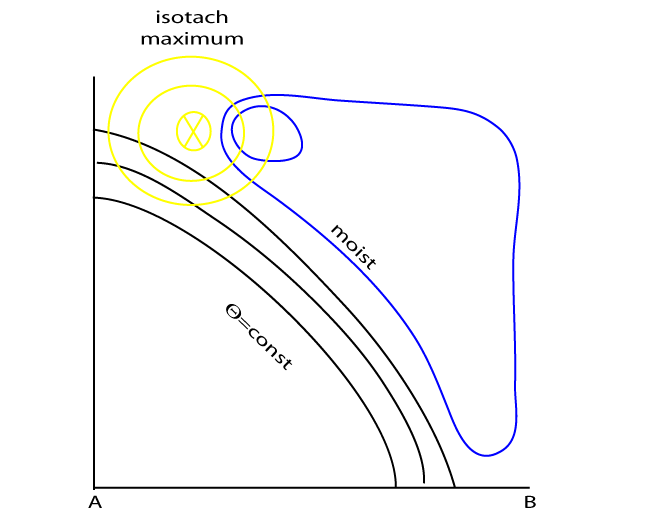 The slope of the isentropes and the humidity distribution are typical for a Warm Front. The humidity maximum occurs along the slope of the isentropes. A secondary humidity maximum, representing the fibre, can be found on the anticyclonic side of the jet maximum. The jet maximum occurs above the forward part of the frontal surface.