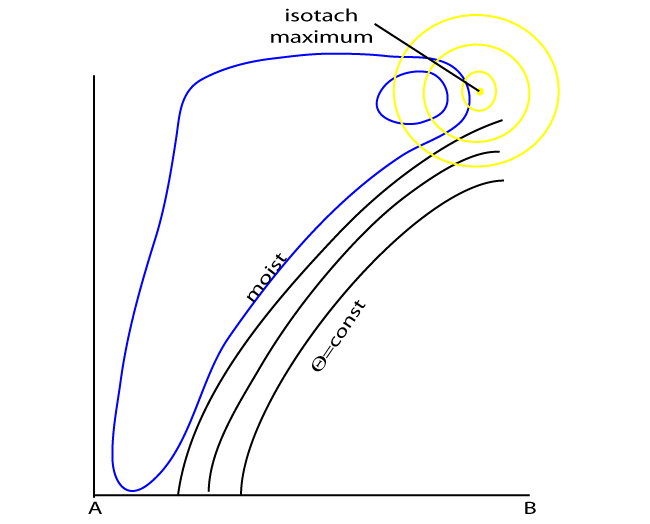 A fibre is sometimes located near a secondary humidity maximum, but the main humidity maximum represents the frontal cloudiness. - Isentropes