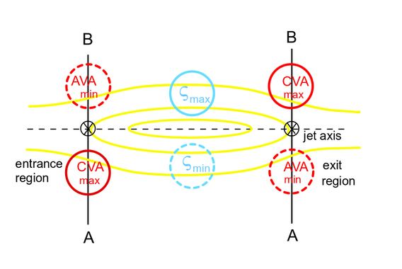The typical distribution of convergence and divergence, which is caused by the vertical circulation in the area of the exit and entrance region of a jet streak, can be explained as follows: As a consequence of the increased wind shear in the centre of the jet streak a maximum of cyclonic relative vorticity can be found on the cyclonic side and a maximum of anticyclonic relative vorticity on the anticyclonic side of the jet axis. As the jet streak propagates downstream, a maximum of positive vorticity advection exists in the left and a maximum of negative vorticity advection in the right exit region. In the area of the entrance region the situation is reversed. On the other hand, as a consequence of the acceleration of the air parcels in the entrance and deceleration in the exit region, ageostrophic wind components can be found. These wind components point, at the jet level, from the anticyclonic to the cyclonic side in the entrance region and from the cyclonic to the anticyclonic side in the exit region. As a consequence of vorticity advection and ageostrophic winds, convergence can be found in the right exit and left entrance, divergence in the left exit and right entrance region at upper levels of the troposhere (at approximately 300 hPa - jet level).