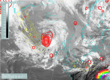 12 August 2005/12.00 UTC - Meteosat 8 IR 10.8 image; red: positive vorticity advection (PVA) 300 hPa, yellow: isotachs 300 hPa