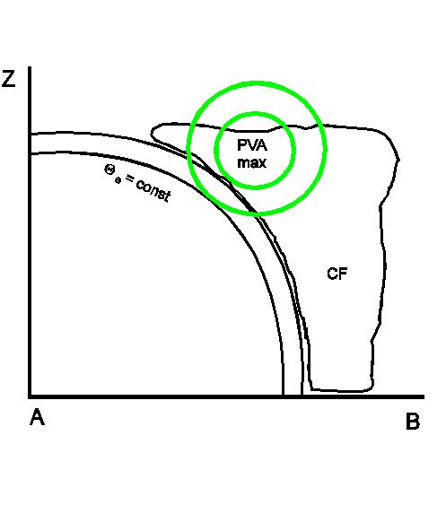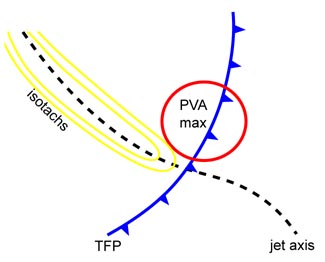 In the ideal case the maximum isotachs should be found upstream from the PVA maximum, but according to the position of the cross section and the stage of development it can also be close to the PVA maximum.