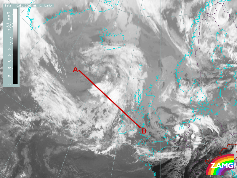 12 August 2005/12.00 UTC - Meteosat 8 IR10.8 image; position of vertical cross section indicated