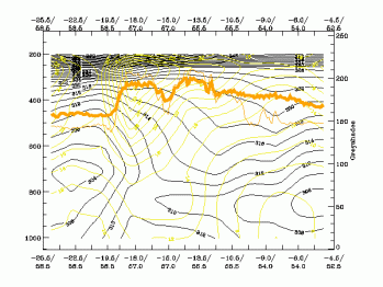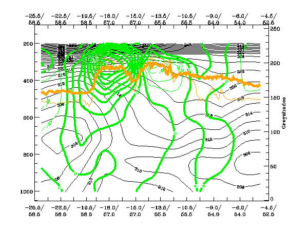12 August 2005/12.00 UTC UTC - Vertical cross section; black: isentropes (ThetaE), yellow: isotachs, orange thin: IR pixel values, orange thick: WV pixel values