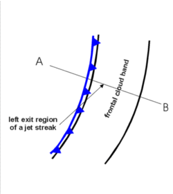 - the cross circulation in the left exit region of a jet streak causes an intensification of the temperature gradient (frontogenesis);