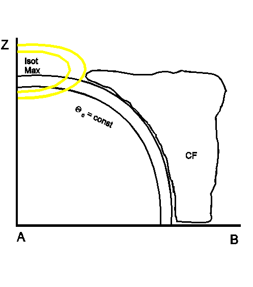 Isentropes of equivalent potential temperature show a Cold Front-like gradient zone, which can often be separated into two parts: a surface and an upper level Cold Front. The surface front generally is more pronounced in the cross section than the upper level front.