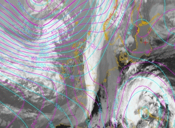 22 August 2005/12.00 UTC - Meteosat 8 IR 10.8 image; cyan: height contours 500 hPa, magenta: height contours 300 hPa
