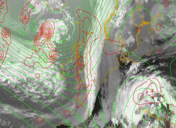 22 August 2005/12.00 UTC - Meteosat 8 IR 10.8 image; green: height contours 300 hPa, red: positive vorticity advection (PVA) 300 hP