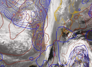 22 August 2005/12.00 UTC - Meteosat 8 IR 10.8 image; blue: shear vorticity 300 hPa, brown: curvature vorticity 300 hPa