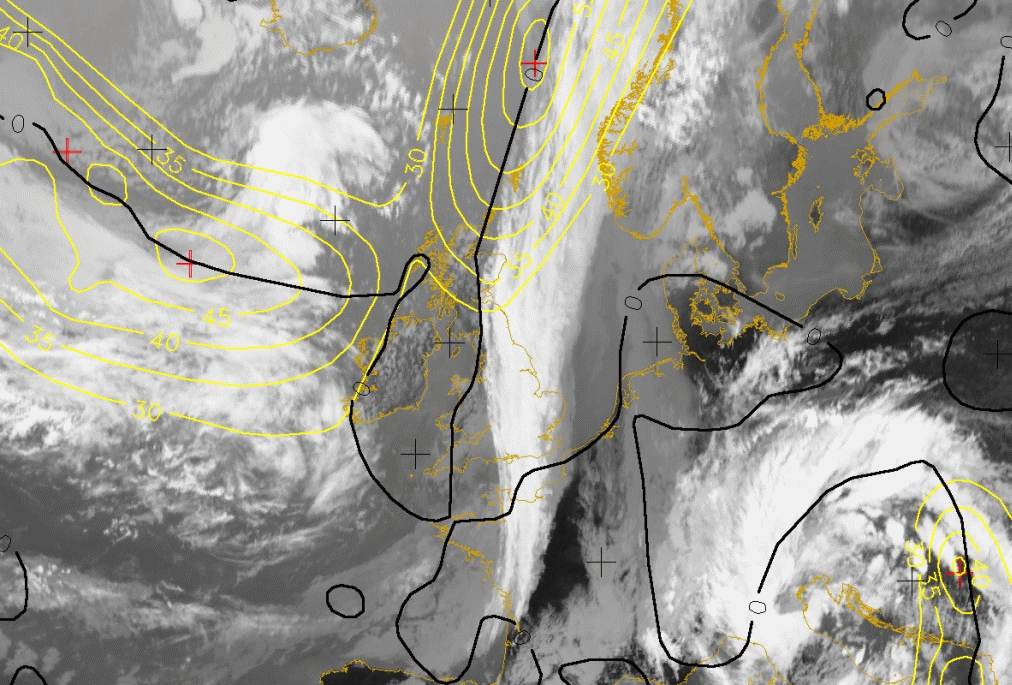 22 August 2005/12.00 UTC - Meteosat 8 IR 10.8 image; black: zero line of shear vorticity 300 hPa, yellow: isotachs 300 hPa