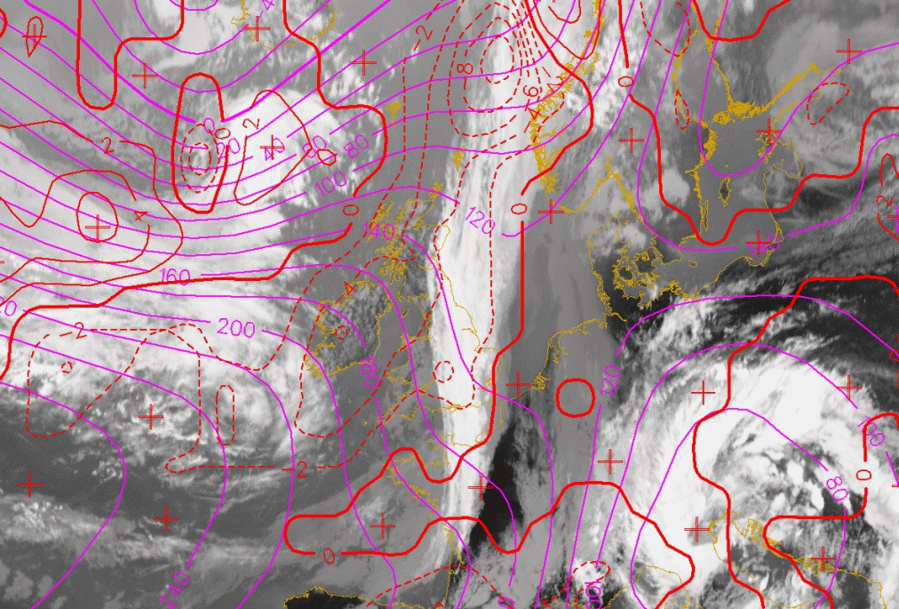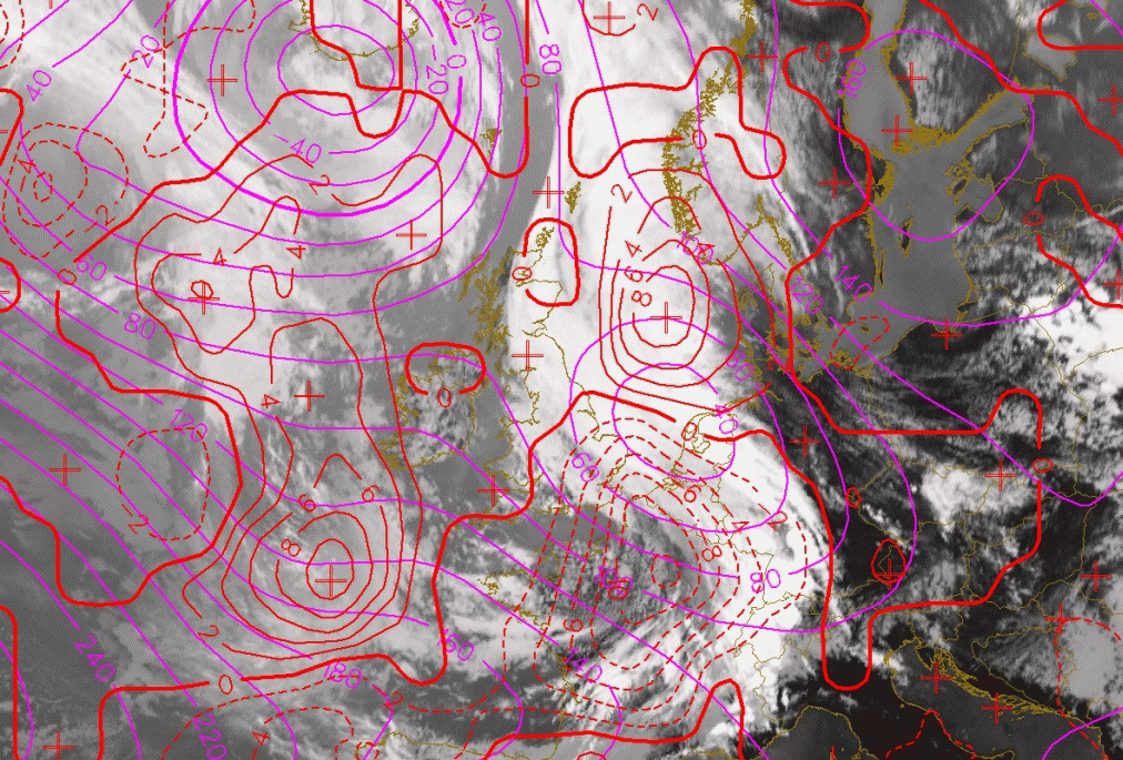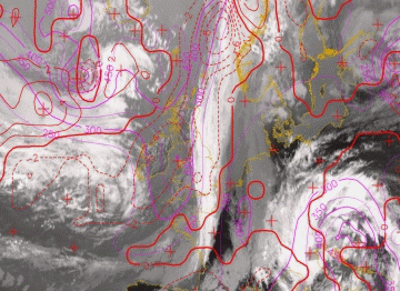 04 July 2005/12.00 UTC - Meteosat 8 IR 10.8 image; red: temperature advection 700 hPa, magenta: height contours 1000 hPa