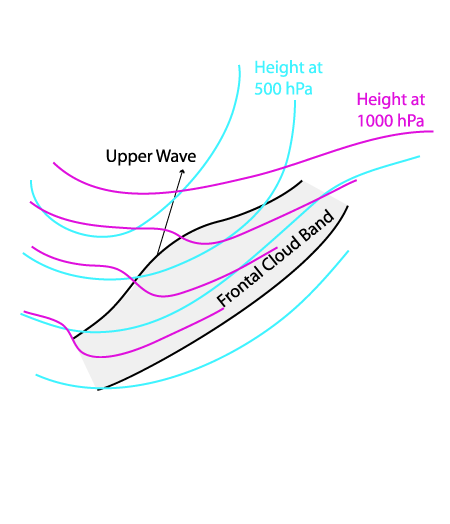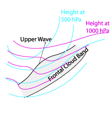 - Surface and mid level height contours: similar appearance to a CF (see Cold Front ), no separate pressure minimum or deepening trough, normally associated with a "classical" Wave (see Wave )
