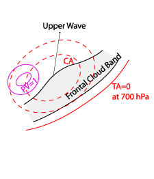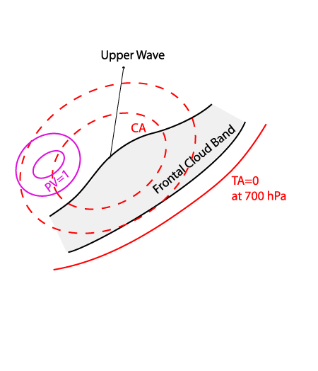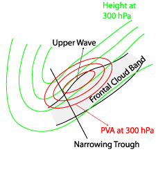 - Significantly sharp and deepening trough to the rear of the cloud band