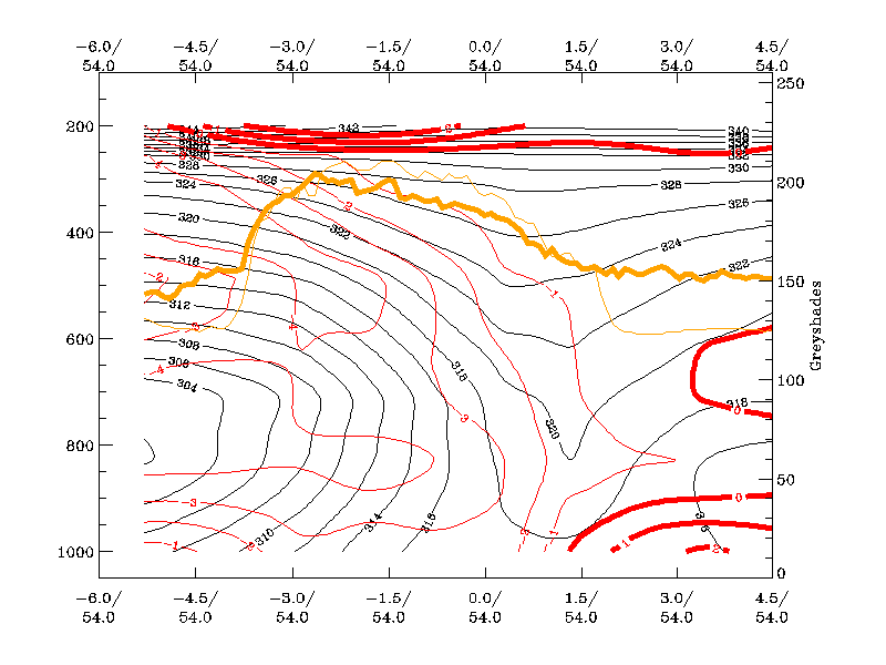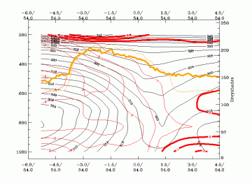 22 August 2005/12.00 UTC - Vertical cross section; black: isentropes (ThetaE), red thin: temperature advection - CA, red thick: temperature advection - WA, orange thin: IR pixel values, orange thick: WV pixel values