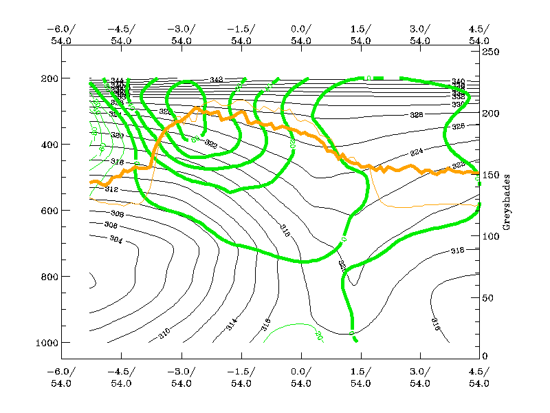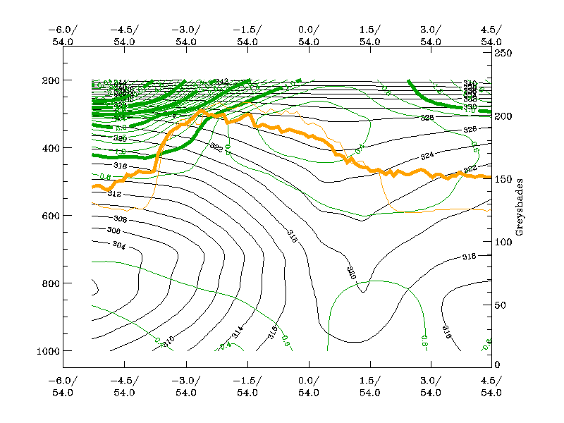 04 July 2005/12.00 UTC - Vertical cross section; black: isentropes (ThetaE), dark green thin: potential vorticity <1 unit, dark green thick: potential vorticity >=1 unit, orange thin: IR pixel values, orange thick: WV pixel values