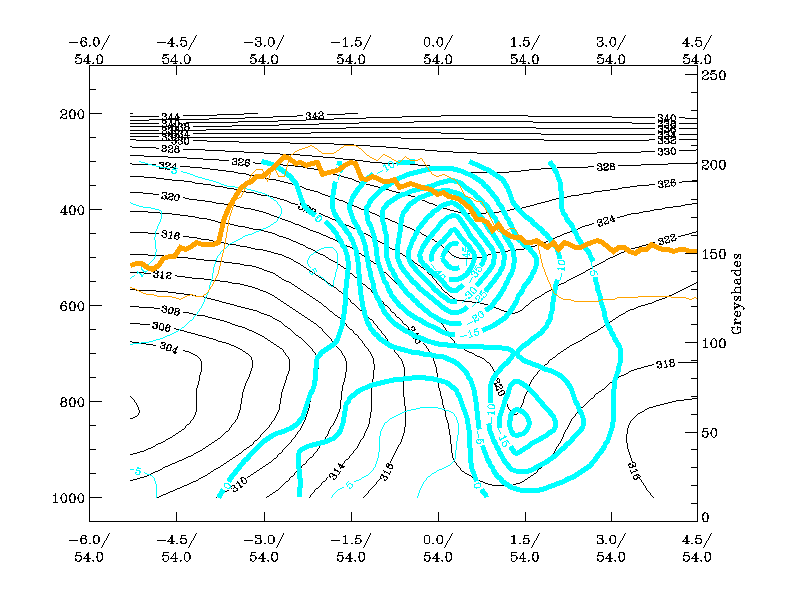 22 August 2005/12.00 UTC - Vertical cross section; black: isentropes (ThetaE), cyan: vertical motion (omega) - upward motion, orange thin: IR pixel values, orange thick: WV pixel values