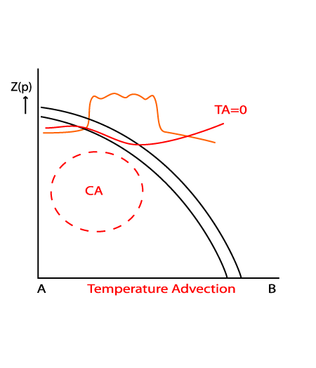 Maximum at 300 hPa or at higher levels, connected to tropopause folding (related to potential vorticity), cold advection below the Wave bulge at lower levels - Vorticity Advection: