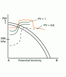 Below left is the case of an Upper Wave, below right is the case of a Wave (2nd row below left shows vertical cross section over Wave bulge). While the Upper Wave has no separate maximum of PV>=1 unit at low levels, the Wave case from the 4 July 2005/12.00 UTC shows a distinct maximum at low levels, which is usually more intense and can exceed PV>=2 units.