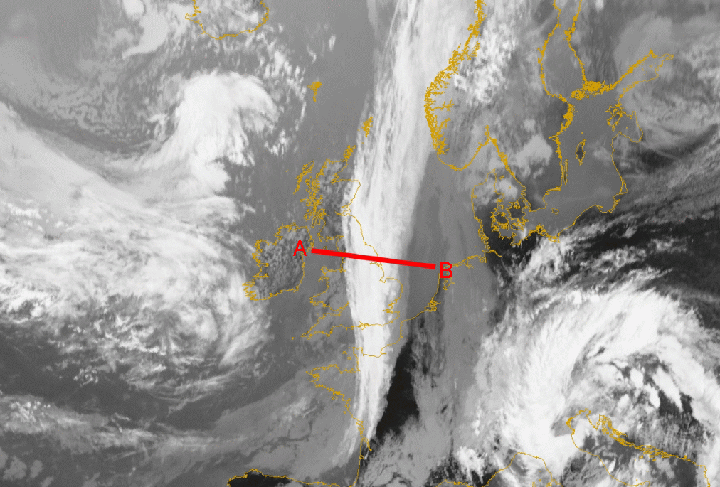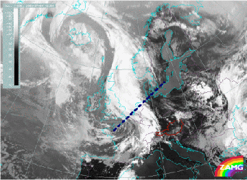 04 July 2005/12.00 UTC - Meteosat 8 IR 10.8 image; position of vertical cross section indicated