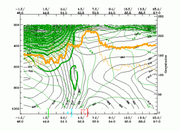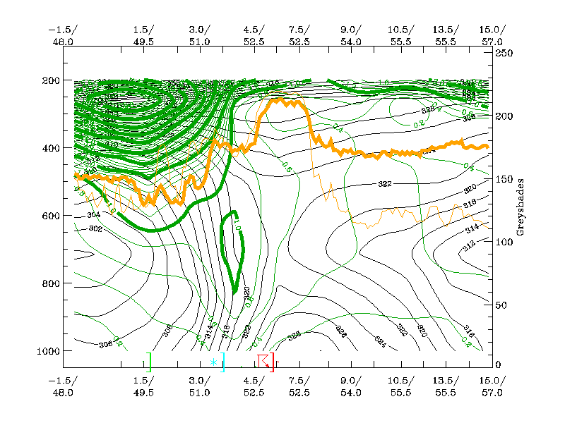 22 August 2005/12.00 UTC - Vertical cross section; black: isentropes (ThetaE), dark green thin: potential vorticity <1 unit, dark green thick: potential vorticity >=1 unit, orange thin: IR pixel values, orange thick: WV pixel values