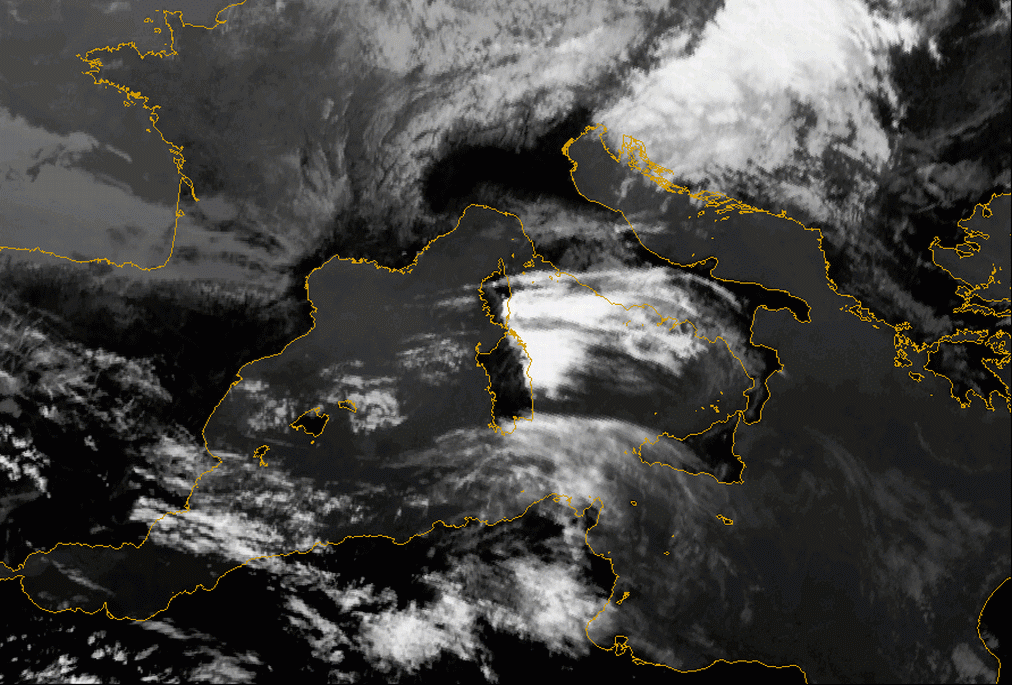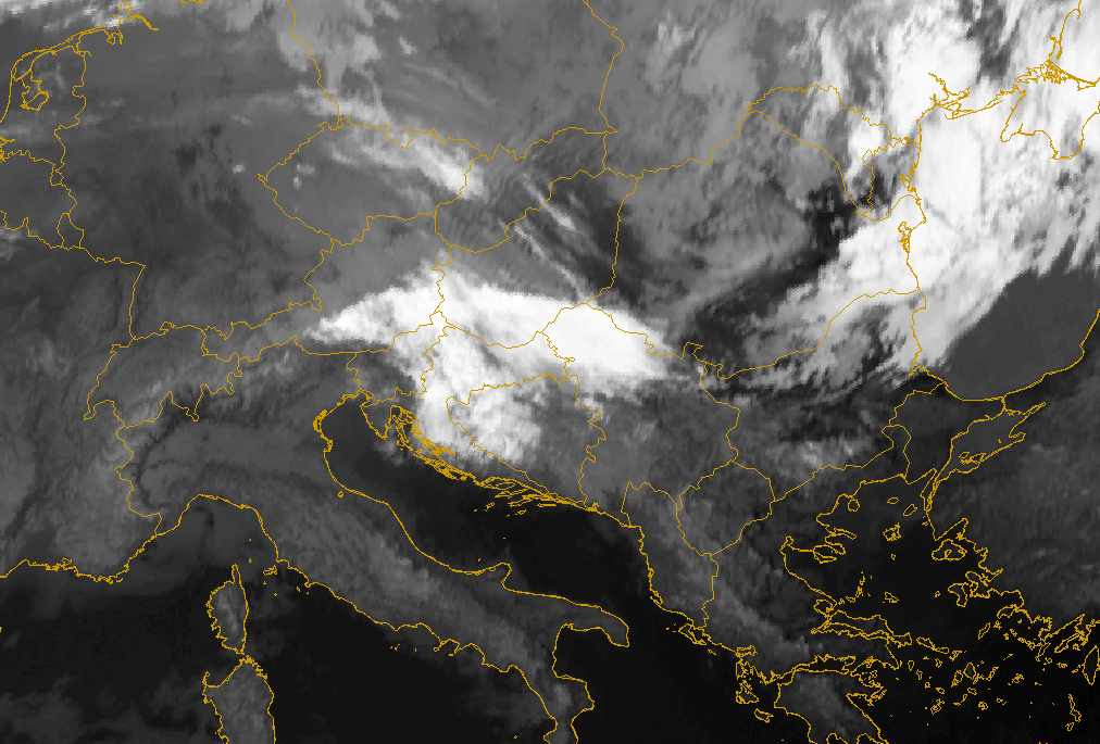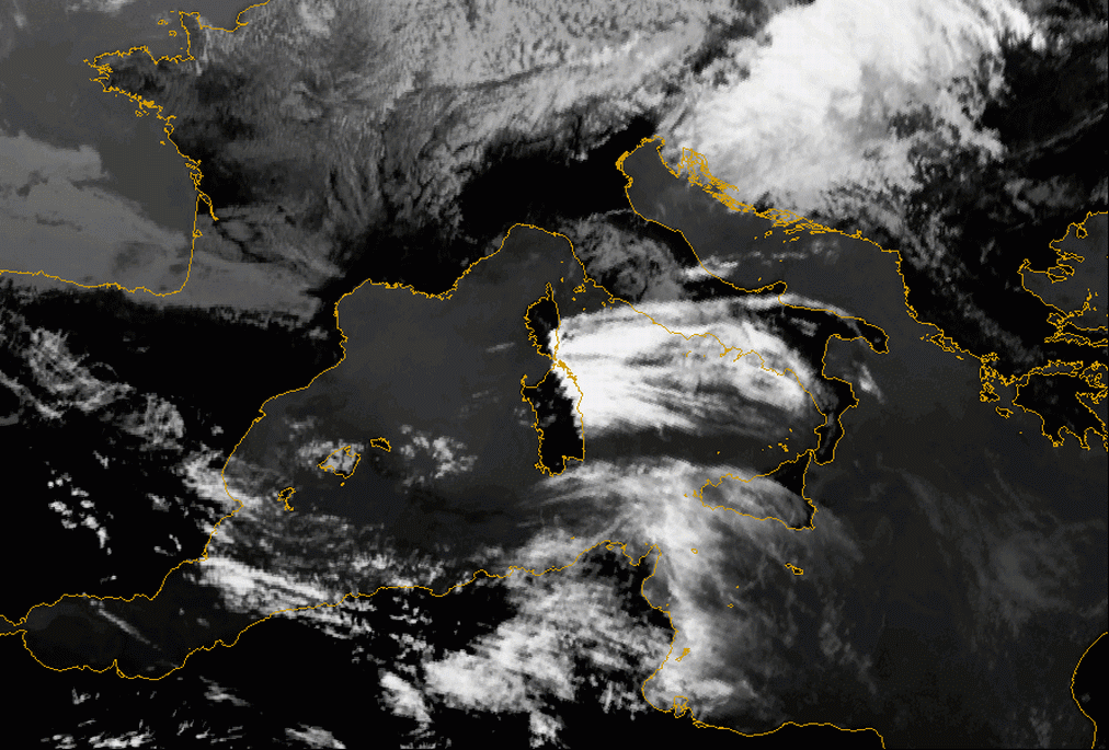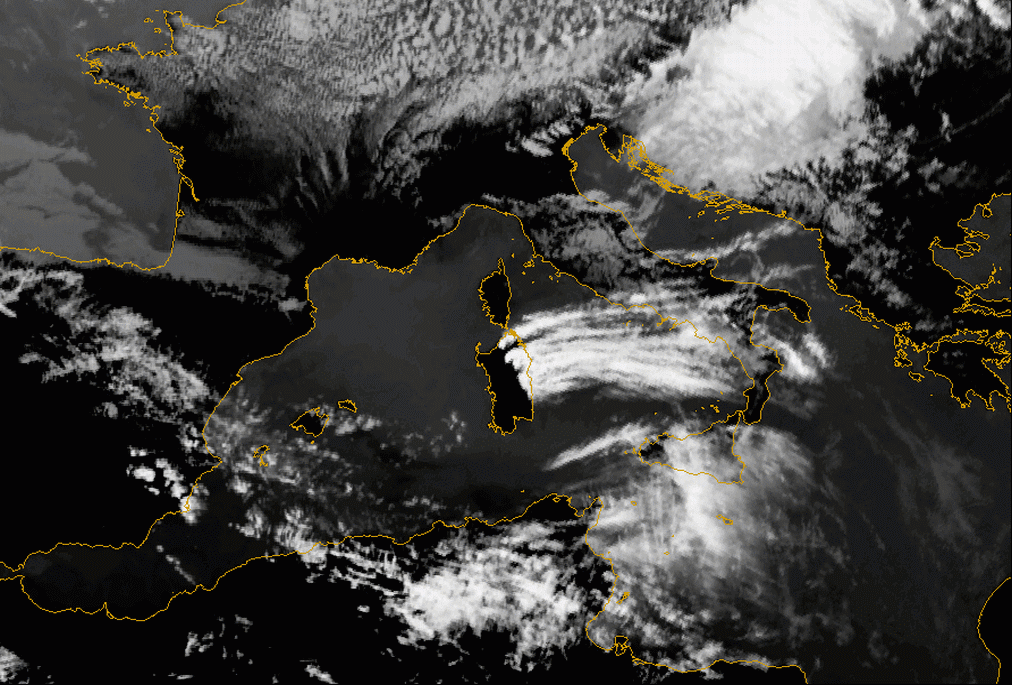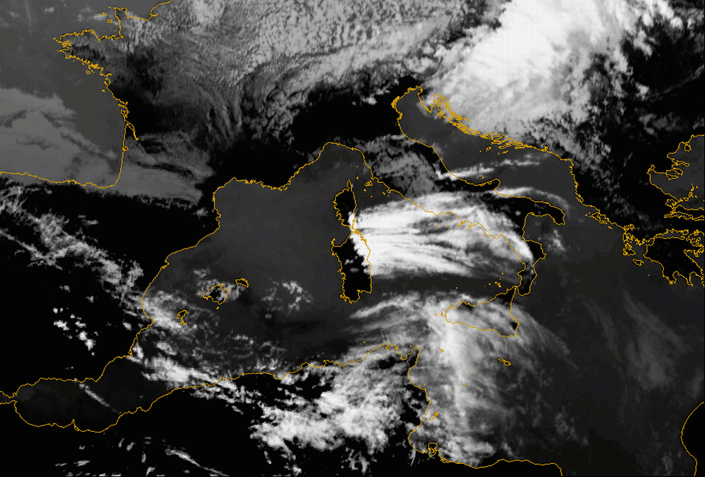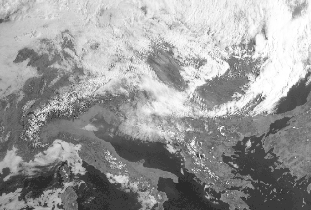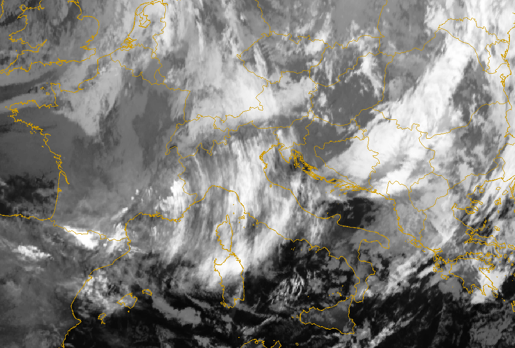 High and thin Lee clouds have formed over the Southern part of the Alps. The cloudiness is extending very far to the south, across Italy.