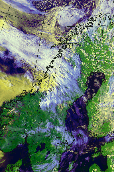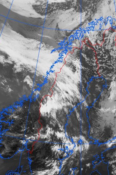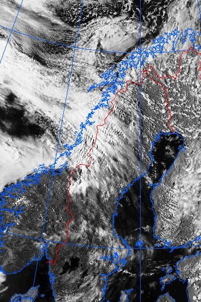 This example illustrates both of the above-mentioned Lee Cloud types. A strong west-northwesterly jet stream is blowing across the Norwegian mountains causing narrow cloud lines parallel to the mountain ridge; these lines are best seen in the NOAA 124 image. The Cirrus plume extends a few hundred kilometers downstream to central Sweden.