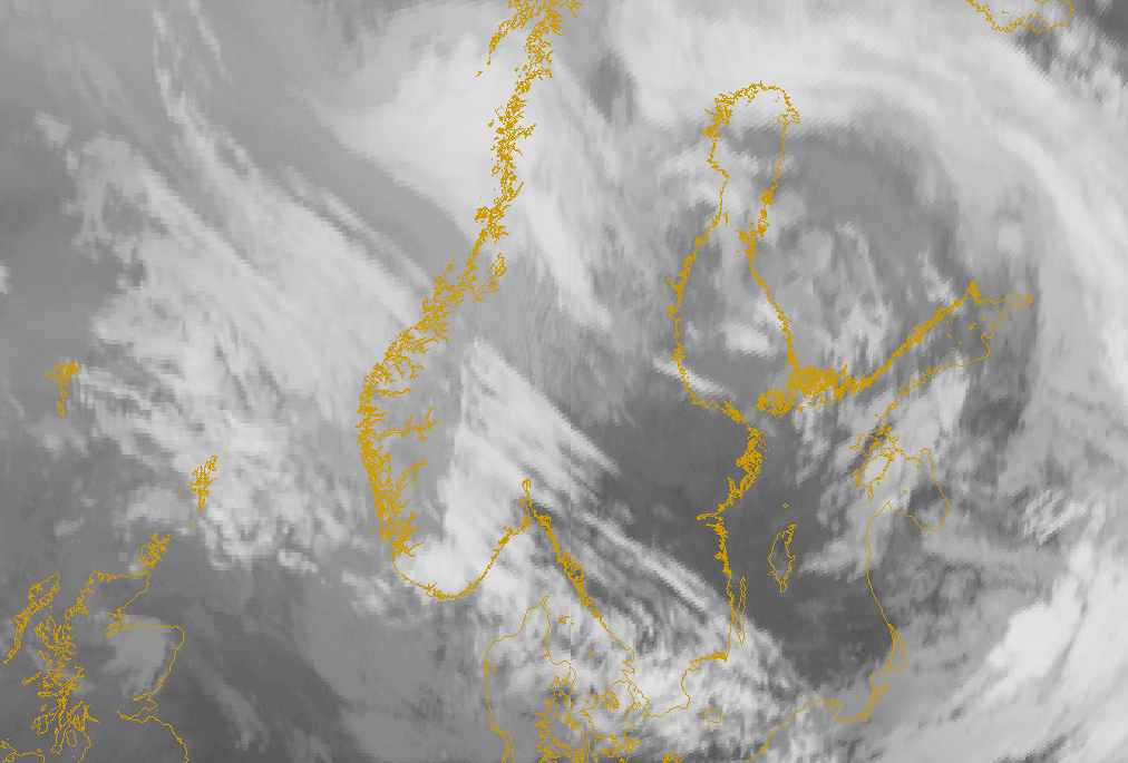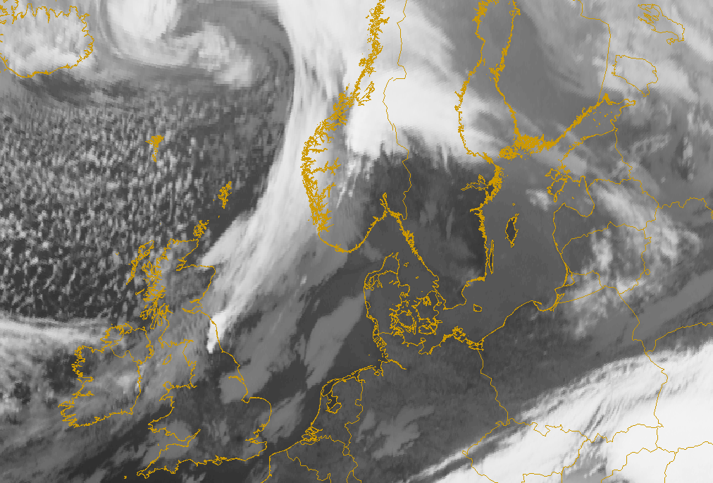The image reveals two areas with high Lee cloudiness. First, Lee clouds that formed over England and are in the image found over the North Sea. Second area of interest is over the Norwegian mountains where high Lee Cloudiness is being formed and is extending far into Sweden and the Baltic Sea. The sharp boundary of the mountain ridge on which the Lee clouds develop is well observed for both areas.