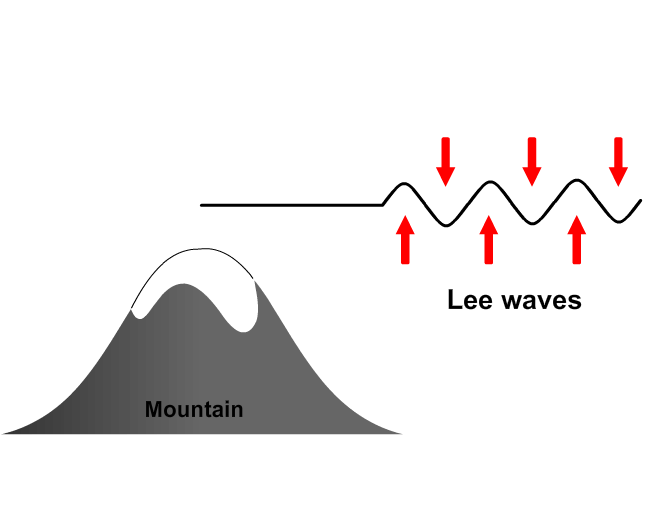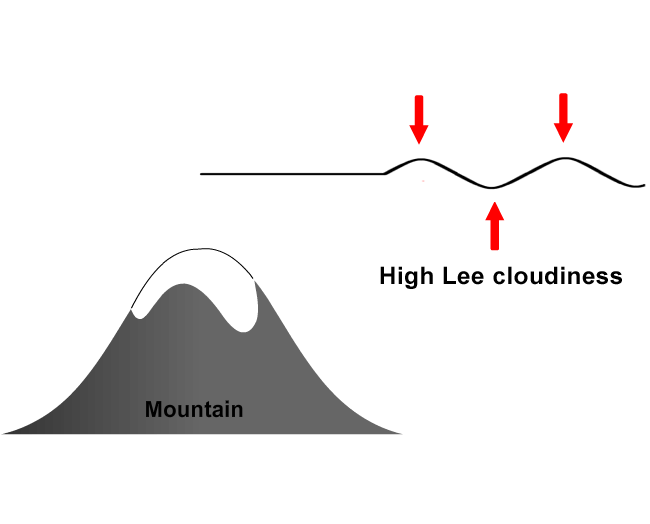 Sometimes the Lee Waves are situated immediately behind the mountain and the High Lee Cloudiness is found further downwind.