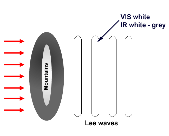 • Lee Wave Clouds, which are characterised by narrow middle level cloud bands perpendicular to the wind direction and parallel to the mountain chain. The length of the wave varies in range from about 3 - 40 km. They can easily be observed with high resolution images (e.g. Meteosat Second Generation and METOP polar orbiting satellite). Their crests are always white in the visible image but in the IR image they can vary from white to dark grey depending on their temperature (cloud top height).