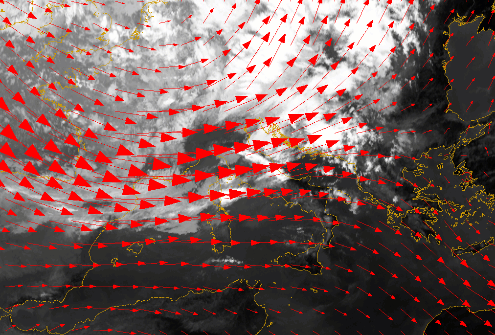 In this case there are westerly winds. The Lee Cloudiness is formed over the mountains in Corsica which are oriented perpendicular to the wind direction. The Lee clouds can be found over the Mediterranean and extend even over Italy.