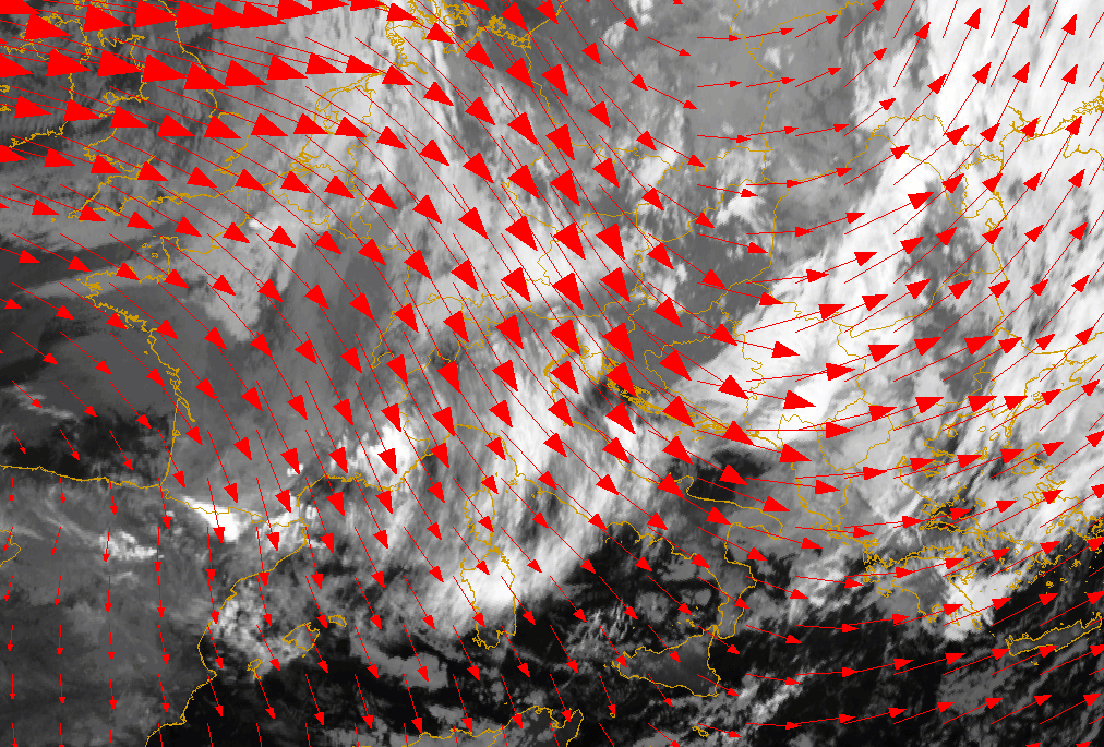 04 July 2007/06.00 UTC - Meteosat 8 IR10.8 image; red: wind vectors 500 hPa