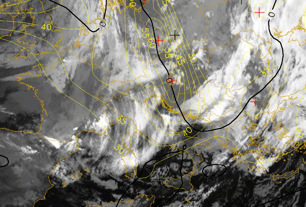 13 November 2006/00.00 UTC - Meteosat 8 IR10.8 image; yellow: isotachs 300 hPa, black: zero line of shear vorticity 300 hPa