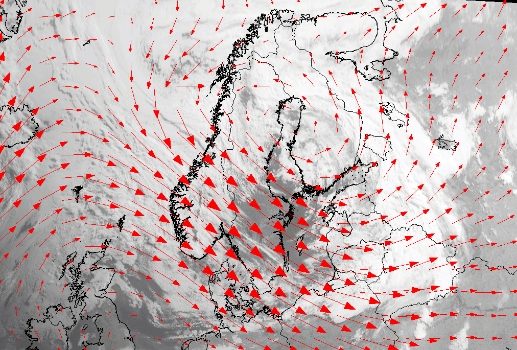 The image reveals two areas with high Lee cloudiness. First, Lee clouds that formed over England and are in the image found over the North Sea. Second area of interest is over the Norwegian mountains where high Lee Cloudiness is being formed and is extending far into Sweden and the Baltic Sea. The sharp boundary of the mountain ridge on which the Lee clouds develop is well observed for both areas.
