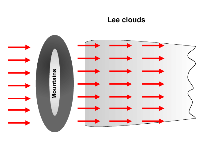 - Lee Clouds are sometimes associated with strong down slope winds causing a narrow dry zone along the lee slope. This can result in a gap in the Lee Cloudiness just behind the mountain ridge, clearly identifiable in AVHRR images.