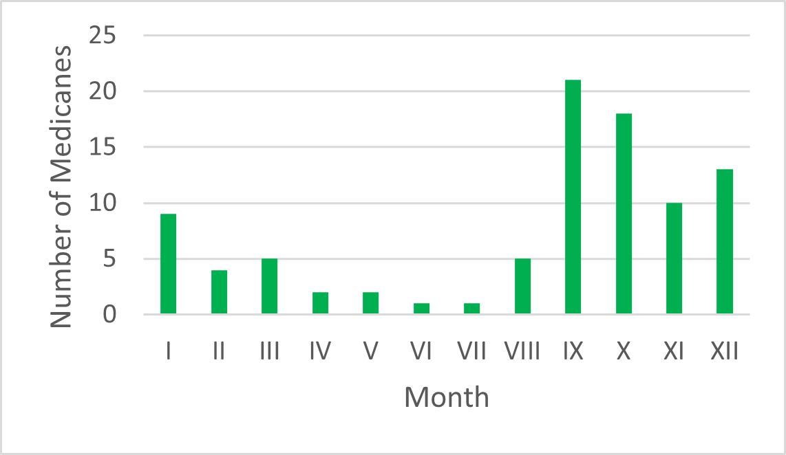 Between 1947 and 2020, 91 tropical-like cyclones (TLC) were recorded over the Mediterranean. An analysis of these records shows that these events mostly take place late in the year, with the highest rates found in September (21 cases), followed by October, December and November (Figure 2). The reason for this is the combination of cold upper air intrusions and sea water that has had time to warm up. Medicanes most commonly impact the Balearic and Aeolian Islands, Sardinia, Sicily, and southern Italy, although large numbers of casualties have also been recorded on the northern coast of Tunisia. In the past few years, storms such as Zorbas (2018) and Ianos (2020) resulted in casualties and significant damage in Greece.