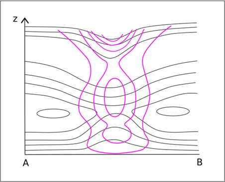 Figure 2: A schematic of the vertical cross section (above) and an actual vertical cross section (below) showing the equivalent potential temperature (black lines) and the PVA (pink lines) from ECMWF model data.