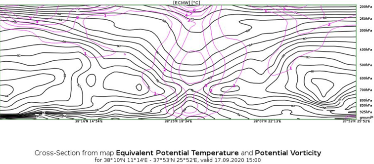 At 1500 UTC on 17 September, Ianos was already a medicane and the PV structure has the characteristic alignment throughout the troposphere, with the creation of a PV 'tower' in the center of the medicane.