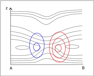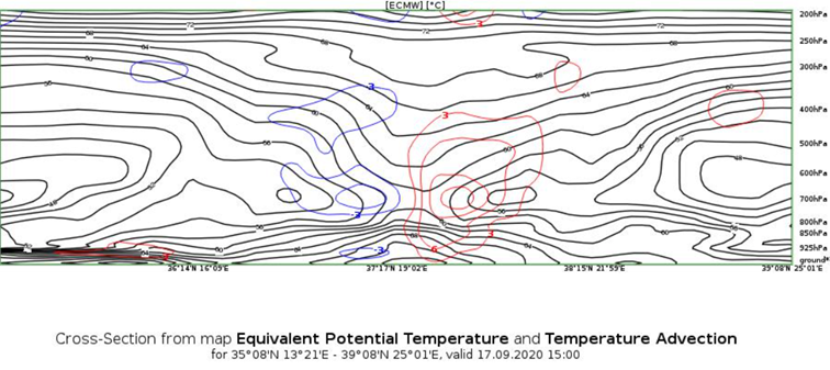 Figure 3: A schematic of the vertical cross section (above) and an actual vertical cross section (below) showing the equivalent potential temperature (black lines) and the temperature advection (red and blue lines) from ECMWF model data.