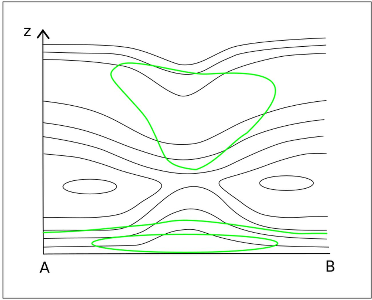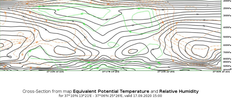 Figure 4: A schematic of the vertical cross section (above) and an actual vertical cross section (below) showing the equivalent potential temperature (black lines) and the relative humidity (green lines) from ECMWF model data.