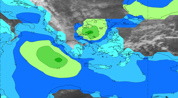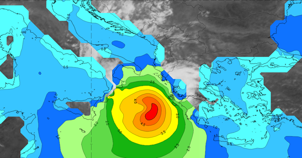 Figure 13 shows that maximum values reached up to 5 meters in the central Ionian. Approximately 12 hours later high waves hit the coasts of the Ionian islands, with a maximum of 5,9 m on Zakynthos.