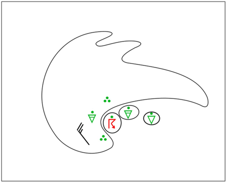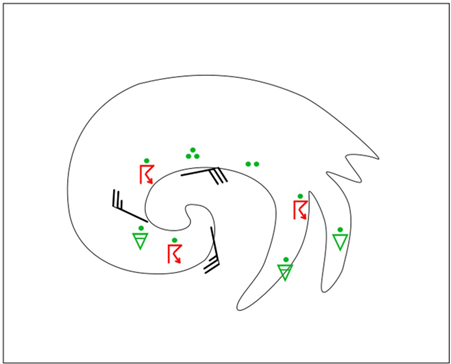 | Precipitation | heavy precipitation (and thunderstorms) in the first phase (related to strong convection) and second phase of development - (within cyclonically curved cloud spiral in the satellite image) in showery and non-showery form (more than 100 mm/h is possible)