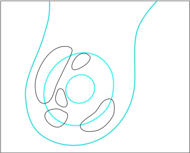 Figure 4: A schematic of the vertical cross section (above) and an actual vertical cross section (below) showing the equivalent potential temperature (black lines) and the relative humidity (green lines) from ECMWF model data.