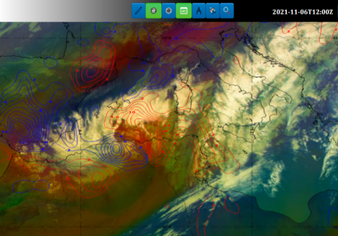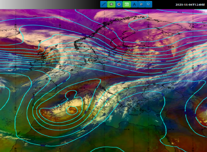 In this composite, reddish contours indicate dry, sinking, cold, stratospheric air, and show areas with high potential vorticity. Since high PV values are crucial in the generation of vorticity in cyclogenesis, a PV intrusion feeds cyclonic development and the further evolution of the medicane.