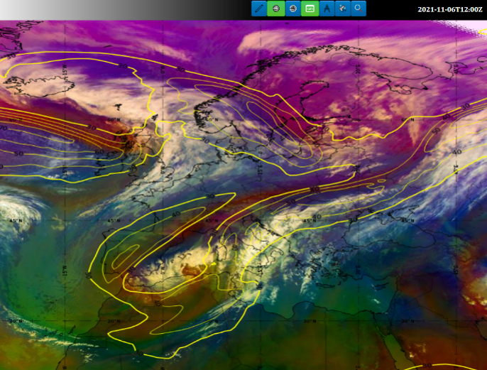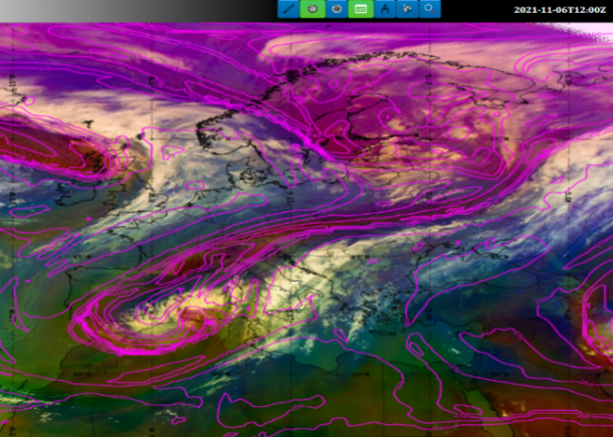 The upper level low is accompanied by a 300 hPa jet stream. The isotachs at 300 hPa in the formation stage show a pronounced jet stream along the rear edge of the convective cloudiness. A jet stream plays an important role in initiating medicane formation. In that early stage it is the most pronounced, while later on its importance fades.