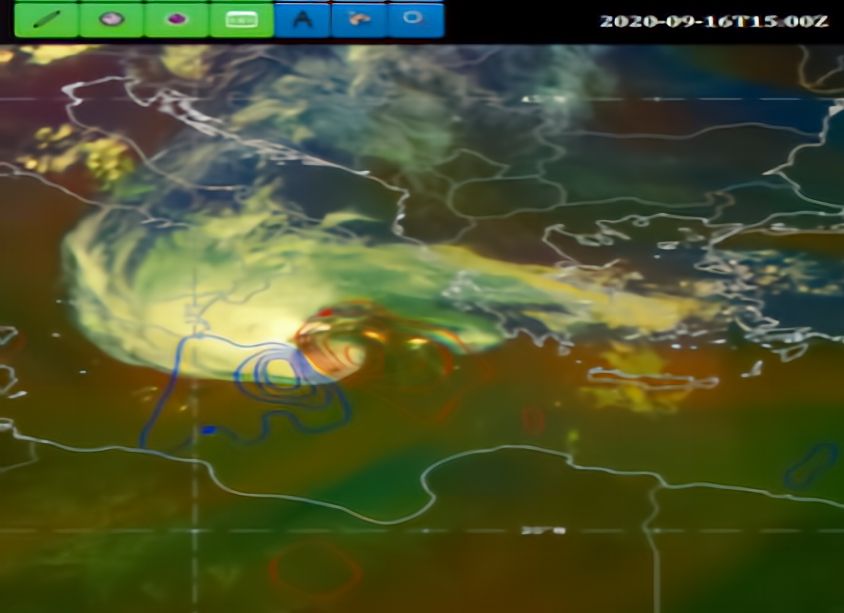 Ianos became a powerful medicane around 0300 UTC on 17 September. At that time, the system formed clear cyclonic rotation and slowly moved east. Convection in this phase is weaker than it was 24 hours earlier, but the total accumulated rainfall (storm total) was among the highest recorded in parts of western and central Greece (645 mm in 24 hours; 769 mm was recorded on the island of Cephalonia in western Greece during the period from 17 to 19 September). Lightning activity occurred along the cyclonic curvature of the cloud band.