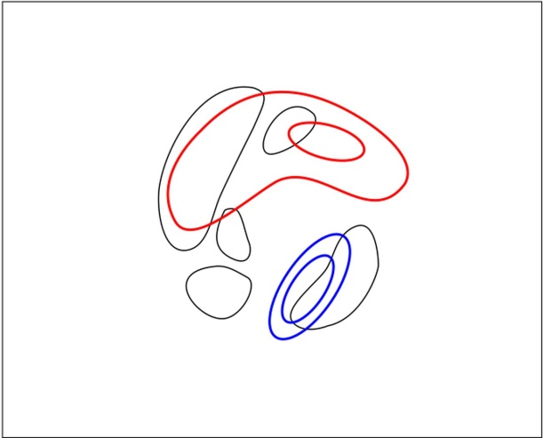 Figure 3: A schematic of the vertical cross section (above) and an actual vertical cross section (below) showing the equivalent potential temperature (black lines) and the temperature advection (red and blue lines) from ECMWF model data.