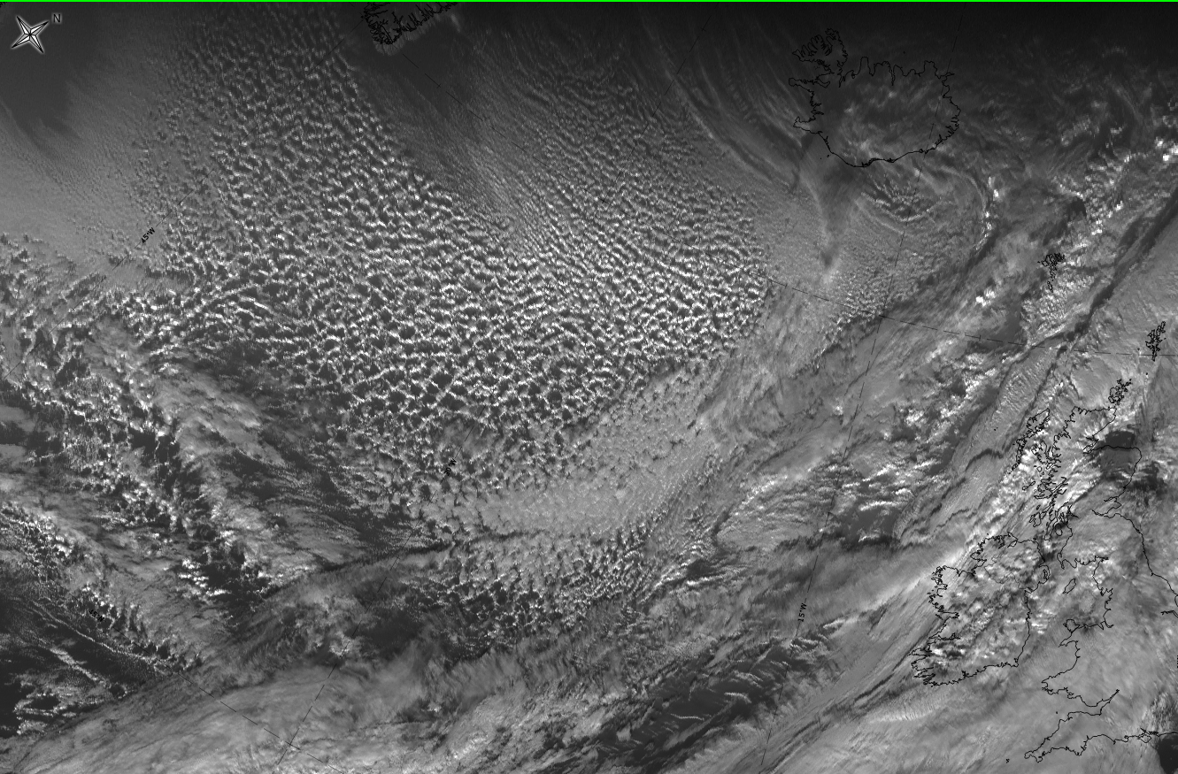 | HRV | A regular pattern of open and closed cell convection; light grey to white clouds. |