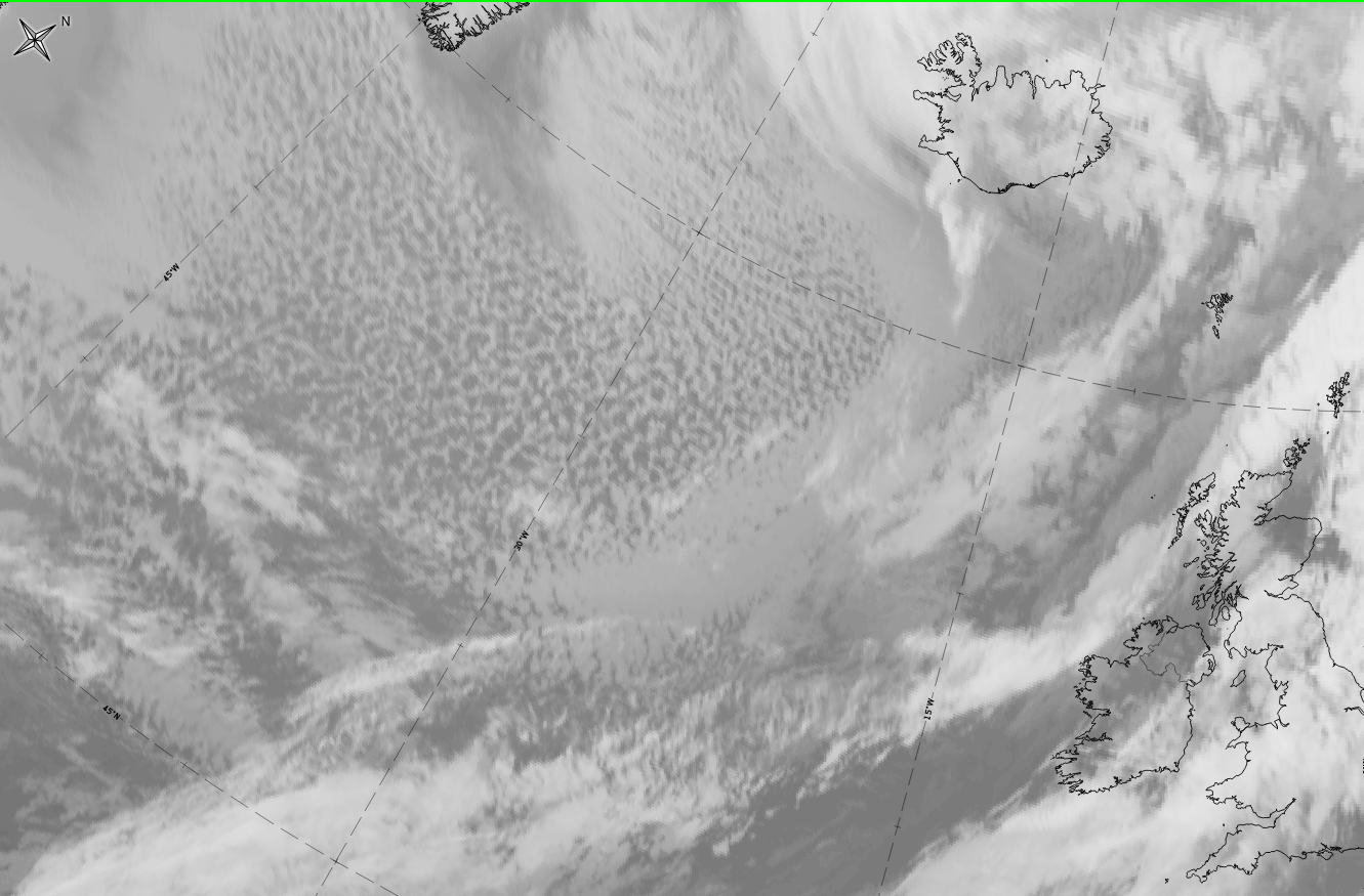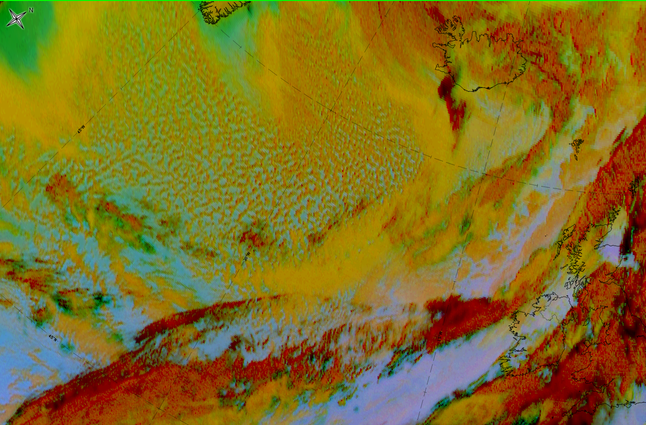 The example from 7 January 2020 at 12 UTC shows a large area of open cell convection in the north Atlantic extending from NW south of Greenland, southeast towards Ireland, as well as a smaller adjacent area to the southeast with closed cell convection.